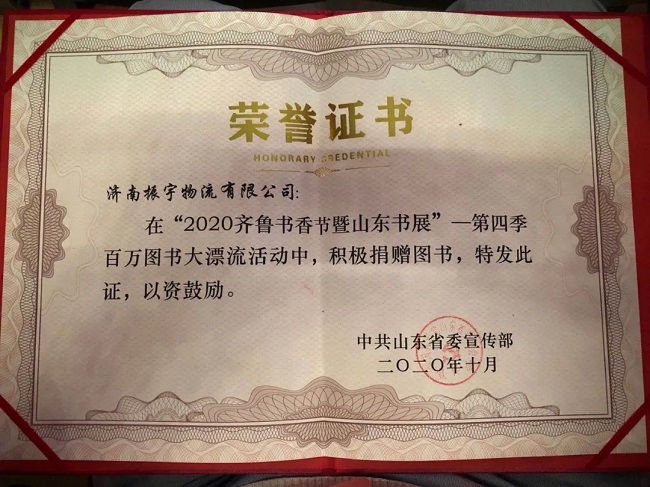 在頒獎環(huán)節(jié),因振宇物流傳遞溫暖與愛心的行為獲取高度評價,領(lǐng)取中共山東省委宣傳部頒發(fā)的榮譽證書。