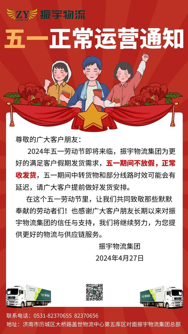 2024年五一勞動節(jié)即將來臨,振宇物流集團為更好的滿足客戶假期發(fā)貨需求,五一期間不放假,正常收發(fā)貨,五一期間中轉(zhuǎn)貨物和部分線路時效可能會有延遲,請廣大客戶提前做好發(fā)貨安排。