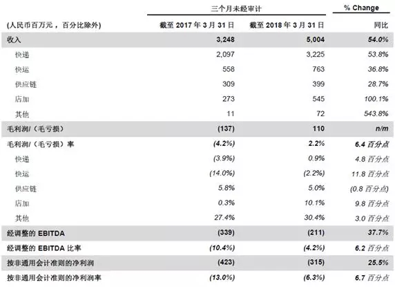 5月10日,百世集團公布2018年第一季度未經(jīng)審計財務業(yè)績:一季度總收入50.04億元人民幣,同比增長54%;毛利潤1.1億元人民幣,與去年同期相比提升6.4%。