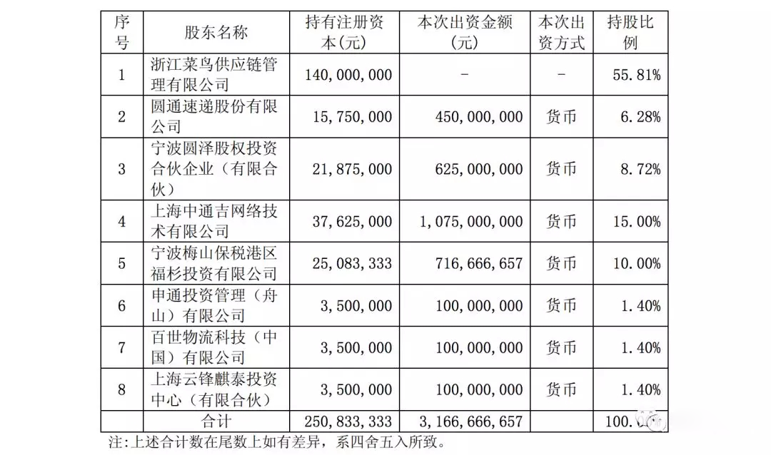 公告顯示,2018年第一季度,浙江驛??傎Y產(chǎn)6922萬元,總負(fù)債7257.9萬元,凈資產(chǎn)-335.9萬元,營業(yè)收入483.3萬元,凈利潤-1.14億元。本次增資前,浙江驛棧由浙江菜鳥供應(yīng)鏈100%控股,本次增資后浙江驛棧的股本結(jié)構(gòu)如下:
