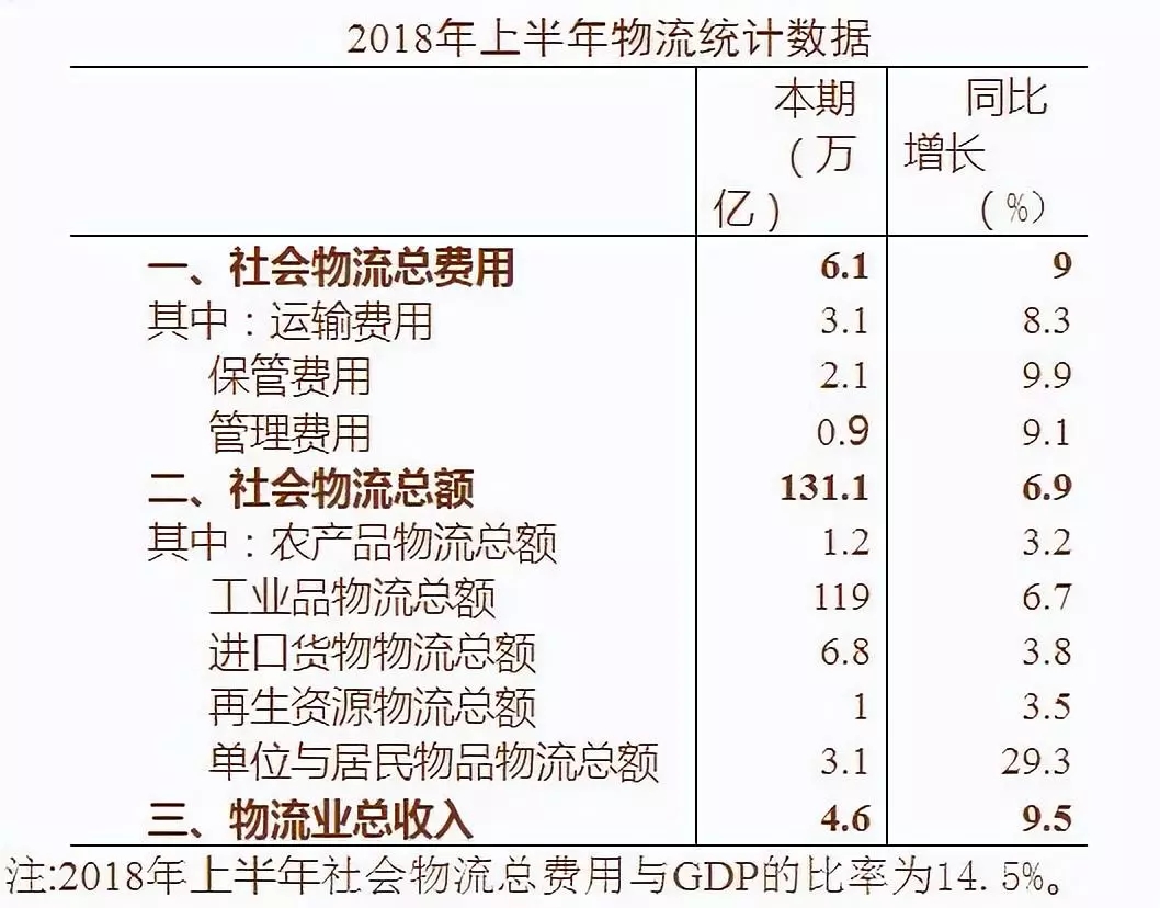 2018年1-6月,社會物流總費用為6.1萬億元,同比增長9%,增速比一季度提高2個百分點;物流市場規(guī)模穩(wěn)步增長,物流業(yè)總收入為4.6萬億元,同比增長9.5%,增速比一季度提高1.3個百分點。